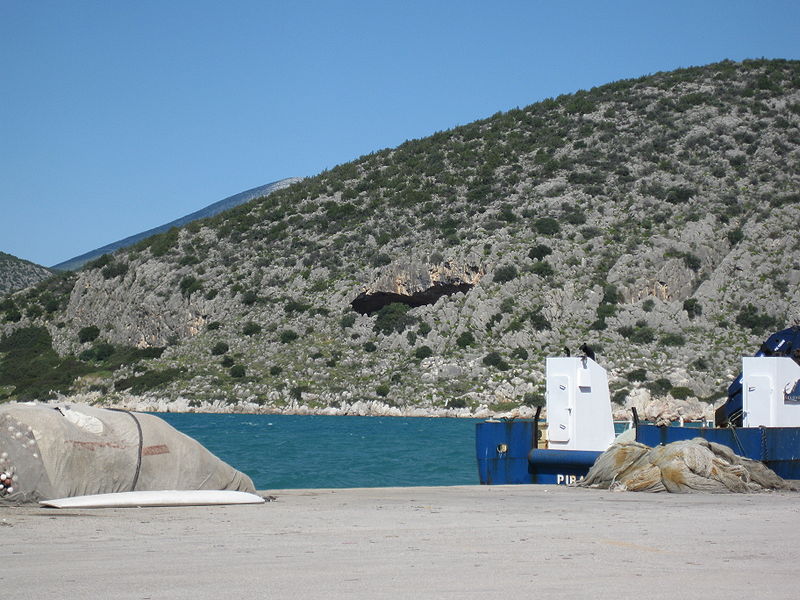 La entrada de la cueva de Franchthi se puede ver en el montículo tras el mar