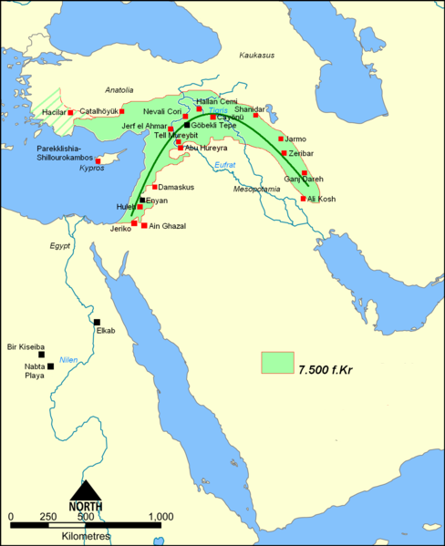 | Mapa del año 7500 a.C., en verde señalado el "Creciente Fértil", donde se pueden ver localizados algunos de los yacimientos que estamos tratando. (Autor: Sten Porse. Fuente: wikipedia) This file is licensed under the Creative Commons Attribution-Share Alike 3.0 Unported license. |
