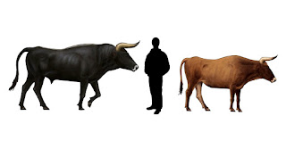| Comparación entre el tamaño de un Uro y el de un toro común actual. El Uro medía 2 metros de alto. (Autor: DFoidl. Fuente: wikipedia). This file is licensed under the Creative Commons Attribution-Share Alike 3.0 Unported license. |