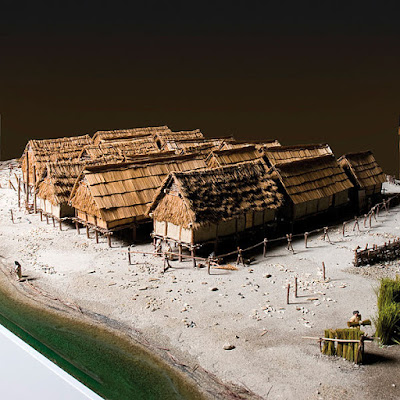 Vemos casas rectangulares construidas sobre grandes postes clavados en la tierra, para evitar las humedades, y están acompañadas de estructuras de empalizadas que rodean las viviendas.