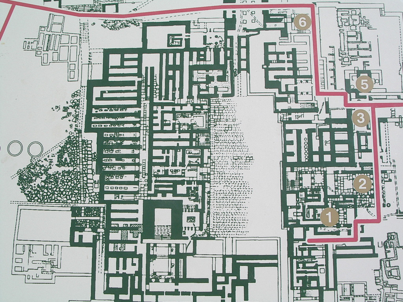 Y para terminar la entrada vamos a citar algunos de los palacios del período de Palacios Recientes (1600-1300 a.C.). Uno de ellos es el Palacio de Hagia Triada, un palacio de planta atípica, muy alargado, pero aún así conservando la entrada al norte.