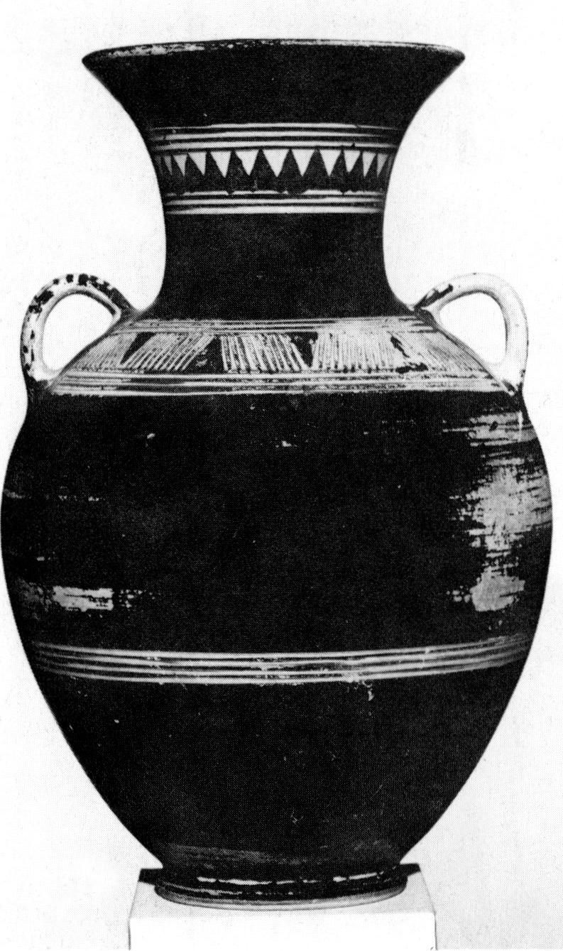- CERÁMICA del GEOMÉTRICO ANTIGUO: es una cerámica de pintura muy simple, está pintada con barniz negro brillante como fondo. Tiene escasos elementos geométricos en comparación con las cerámicas posteriores. Los dibujos geométricos de esta fase son básicamente pequeños triángulos (llamados dientes de lobo), meandros, bandas, líneas, cuadrados y grecas.