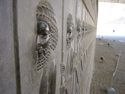 En el arte persa también hay algo que iniciaron los hititas, y que pusieron de moda los asirios, y es la monumentalización de puertas, entradas o salidas, con esculturas que flanquean. Recordad los lámasus asirios, pues en el mundo persa se continúa con esto. Los persas también monumentalizan entradas y salidas con relieves, especialmente con los "genios", y como ejemplo de ello es la siguiente foto, conocida como el genio de Pasagarda.