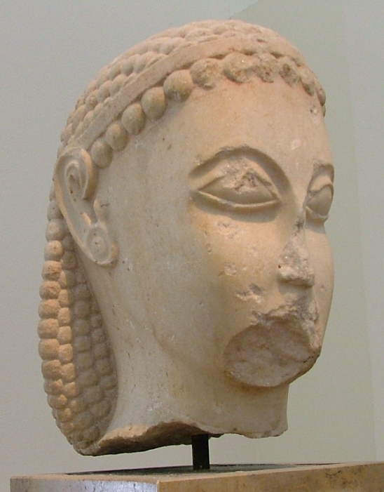 Es muy antigua, fechada en el 600 a.C. aproximadamente. Esta cabeza parece una máscara indígena africana, muy primitiva, es una cara demasiado alargada, con ojos almendrados, sin sonrisa arcaica siquiera, y con una cabellera compuesta en filas verticales con lóbulos de diferente tamaño y distinta disposición. El artista representó esta imagen con una cinta plana (llamada tenia) que le recoge el pelo y que se ata en la nuca. La escultura consigue un buen efecto del claroscuro.