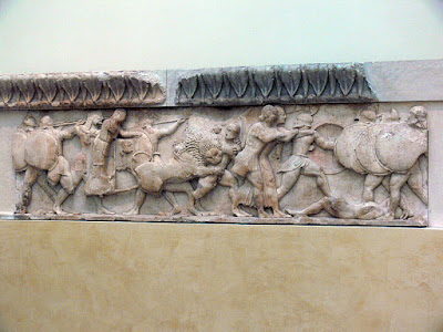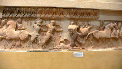 - Friso Sur: representa el rapto de las hijas de Leucipo a manos de Castor y Polux. Aquí se consigue dar perspectiva gracias a la superposición de las patas de los caballos.