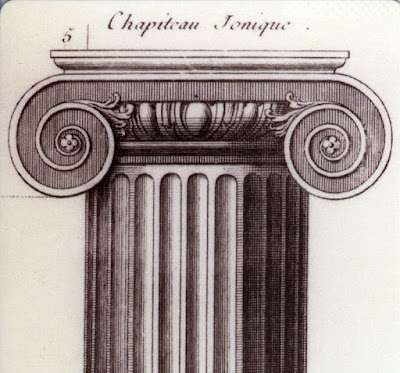 Más arriba llegamos al capitel. Aquí desaparece el collarino que si existía en el dórico. En cambio el equino sigue existiendo, solo que ahora se ha transformado, ganando una rica decoración con óvulos (si, se llama así esta decoración), y volutas. Encima del equino sigue estando el ábaco, aunque en el orden jónico el ábaco puede estar decorado, normalmente con hojas lésbicas (de Lesbos). El ábaco es de planta cuadrada, con un perfil de cima reversa o talón, es decir, parte superior saliente y parte inferior entrante.