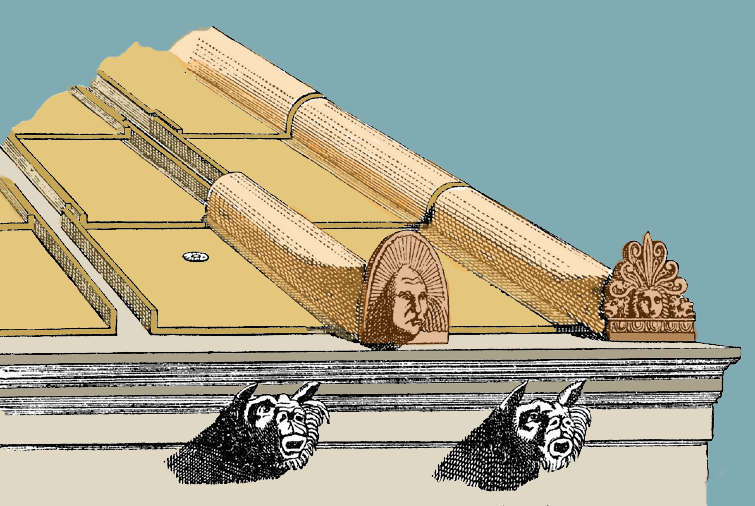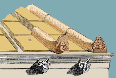 | Tégulas, ímbrices, antefijas y gárgolas (Autor imagen: Fernando Delgado Béjar. Fuente: wikipedia) This file is licensed under the Creative Commons Attribution-Share Alike 3.0 Unported license. |