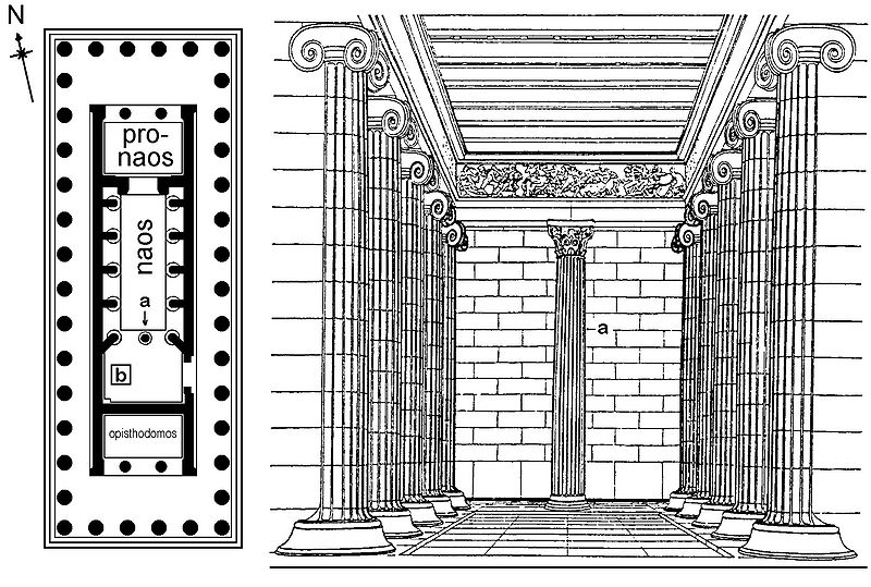 La plata de este templo es arcaica, puesto que las columnas son 6x15 (debería ser 6x13 o 7x15 para ser clásico en este caso, el doble +1). Su pronaos es profunda in antis, con una cella de una sola nave con 12 capillas en su interior. Las columnas exteriores son de estilo dórico, las de dentro de la cella son jónicas, y la única columna central de la cella es corintia, siendo la primera vez que se ven los tres órdenes juntos. Las columnas jónicas están adosadas a un muro, y junto con la columna corintia forman un esquema en forma de "Pi", al igual que el Partenón. Este templo disponía también de una entrada lateral tras la estatua, lo cual es completamente nuevo.
