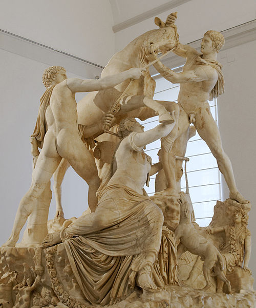 La segunda obra que vamos a ver es el Toro Farnese o Toro Farnesio: representa una escena mitológica en la que dos hermanos, Zeto y Anfión (hijo de Antíope) atan a Dirce (reina de Beocia), como castigo por la crueldad que habían tratado previamente a su madre. Plineo nos dice que era obra de Apolonio y Taurisco. El original, que tendría composición piramidal, debió ser de mediados del siglo II a.C. La que conservamos es una adaptación que fue realizada para las termas de Caracalla en Roma a principios del Siglo III d.C. Es una obra típico del periodo Barroco helenístico, dado la complejidad de la composición piramidal y la multiplicidad en los puntos de vista. Por último señalar que esta obra mide los nada desdeñables 3 metros de altura.