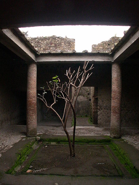 | Pequeño atrio en una casa de Pompeya. Como se puede ver, está abierto por arriba para permitir el paso de luz y agua (Autor foto: Mosborne01 Fuente: wikipedia) This file is licensed under the Creative Commons Attribution-Share Alike 3.0 Unported license. |