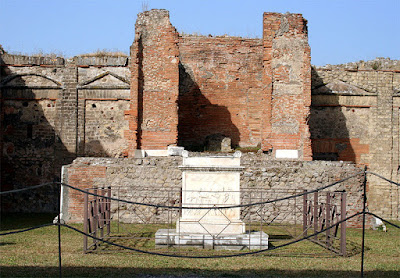 Restos del templo de Vespasiano, con su altar de mármol blanco - Imagen de dominio público - Hay un edificio construido por la sacerdotisa Eumachia, dedicado al culto imperial de la familia Julio Claudia, seguramente por la relación personal que tenía con la emperatriz Livia, mujer de Augusto.
