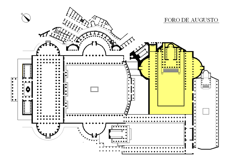 | Plano del foro de Augusto, señalado en amarillo(Autor foto: Foros_imperiales-plano_base.png: 3coma14 derivative work: 3coma14 (talk) Fuente: wikipedia) This file is licensed under the Creative Commons Attribution-Share Alike 3.0 Unported license. |