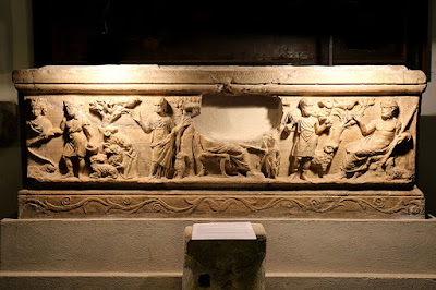 También mencionar, que el frontis de algunos sarcófagos de esta época se reúnen numerosas y pequeñas escenas sin que una ordenación rigurosa organice su agrupación. El relieve es llano y bastante uniforme, los elementos del paisaje, entre las figuras, acentúan el efecto pictórico.