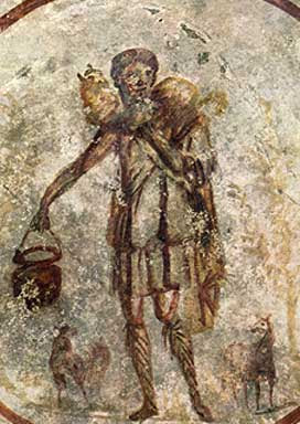 | Otra escena del "Buen pastor", en la catacumba de San Calixto (Callisto) - Imagen de dominio público |